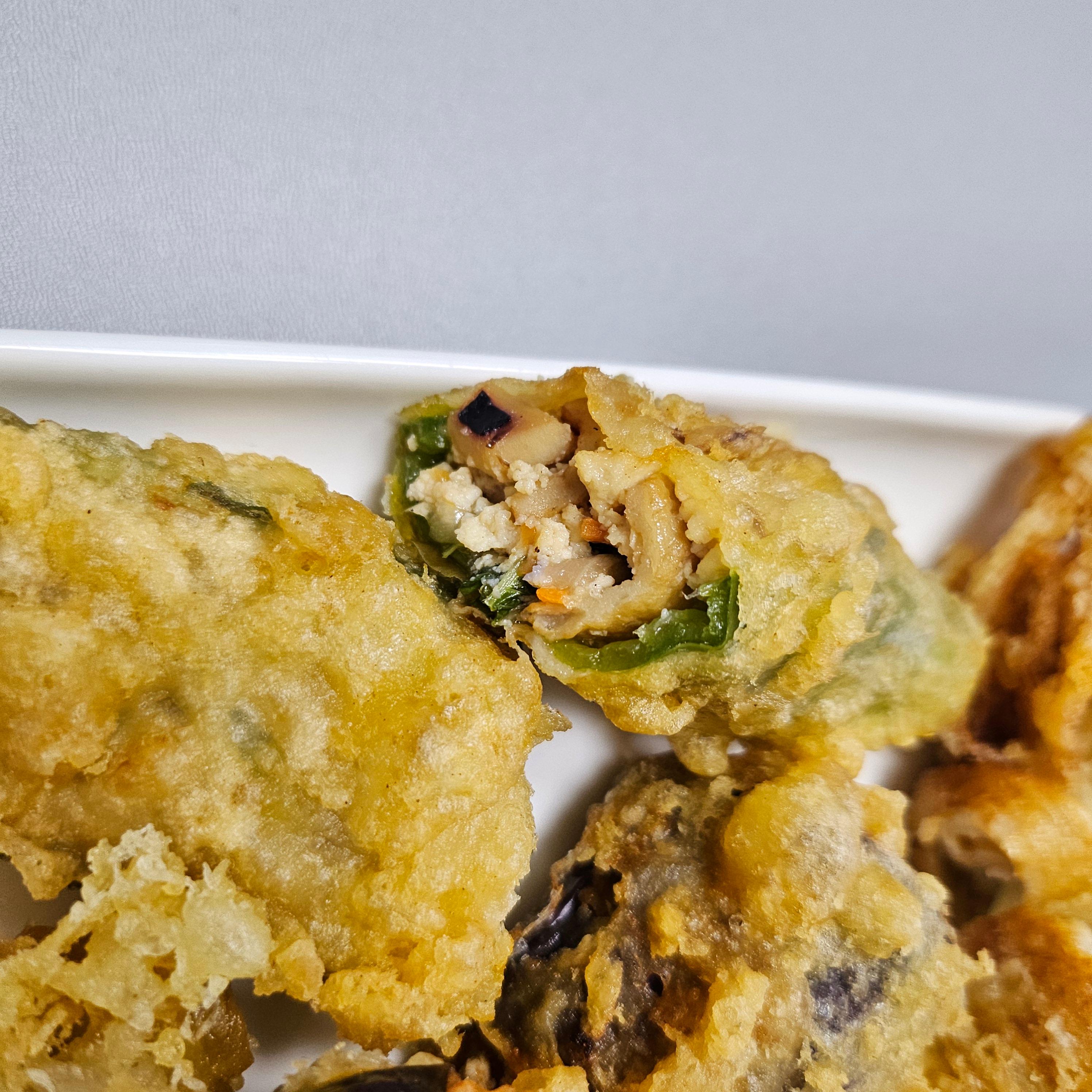 가지와 고추 튀김의 속은 야채와 오징어를 잘게 다녀 넣어 있고요!!