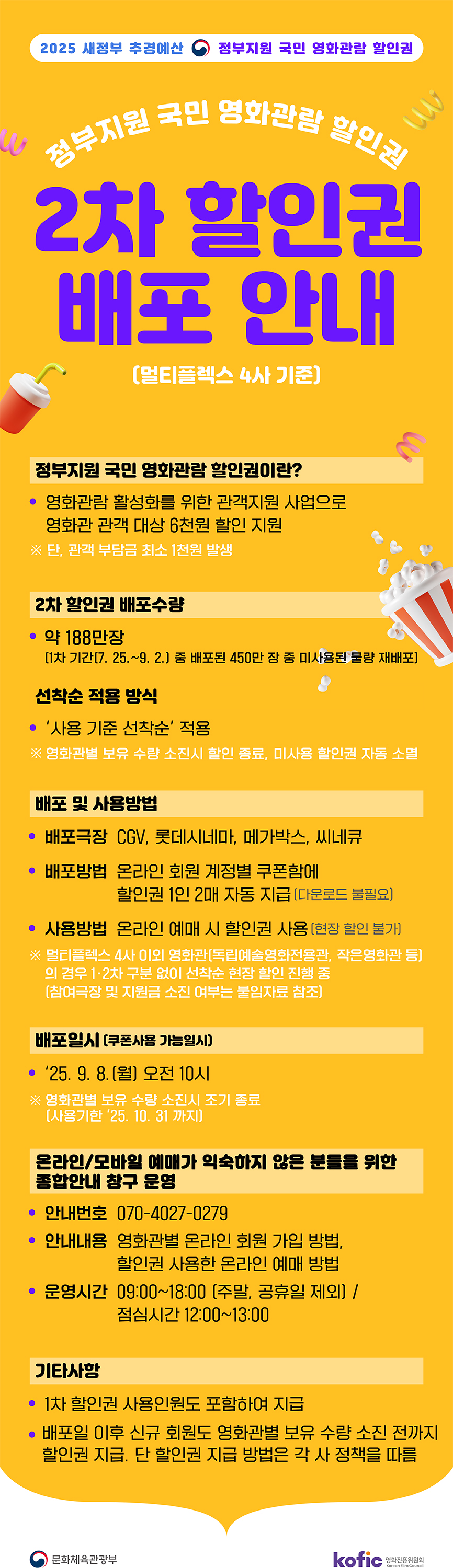 안녕하세요~ :) 지난 7월 문화체육관광부와 영화진흥위원회가 함께 특별한 혜택을 발표했죠.전국 영화관에서 사용할 수 있는 6,000원 할인권을 배포했는데요.선착순으로 발급하는 방식으로저는