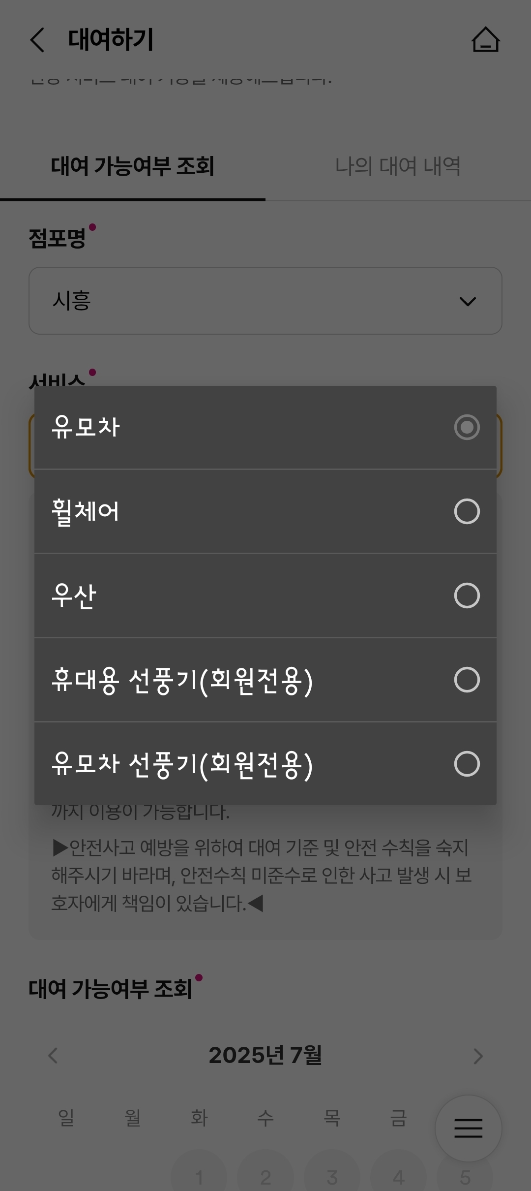 전체 메뉴→서비스 예약/대여→